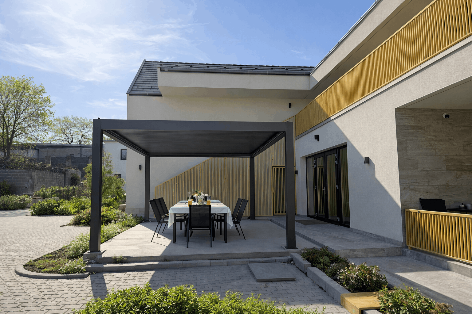 A pergola alatti hangulatos közösségi tér ideális helyszín egy kellemes beszélgetéshez, közös étkezéshez vagy esti kikapcsolódáshoz. A nyugodt környezet és az igényesen kialakított tér tökéletes választás baráti és családi együttlétekhez.